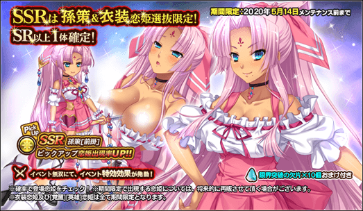 真 恋姫 夢想 天下統一伝 公式 En Twitter 孫策 衣装恋姫選抜ガチャが登場 新登場のssr孫策 前掛 がピックアップで出現率がup 10 1回ガチャではおまけで限界突破の欠片10個をプレゼント ピックアップ恋姫はイベント 母の日感謝大作戦 炎蓮殿 祝われるの